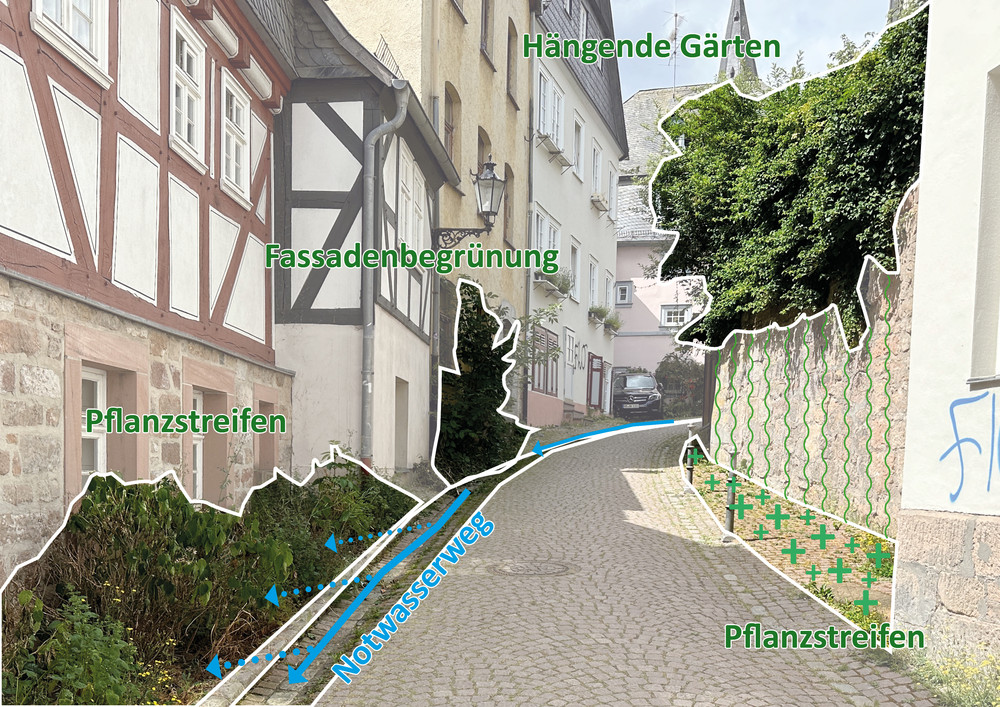 Die Universitätsstadt Marburg verfolgt das Ziel, ihre historische Oberstadt langfristig klimaresilient zu entwickeln und auf zunehmende Hitzeperioden sowie Starkregenereignisse vorzubereiten. Aufgrund der dichten mittelalterlichen Bebauungsstruktur, begrenzter Freiräume und denkmalpflegerischer Anforderungen besteht ein besonderer Bedarf an integrierten und kleinteiligen Lösungen der Klimaanpassung.
