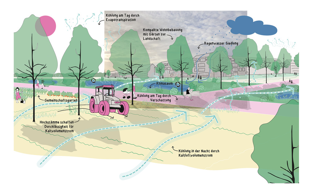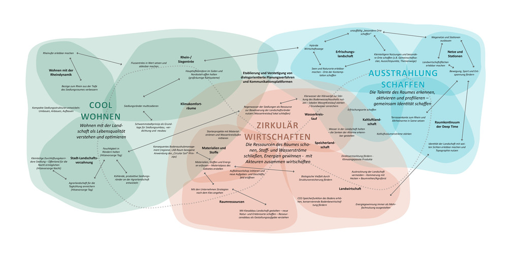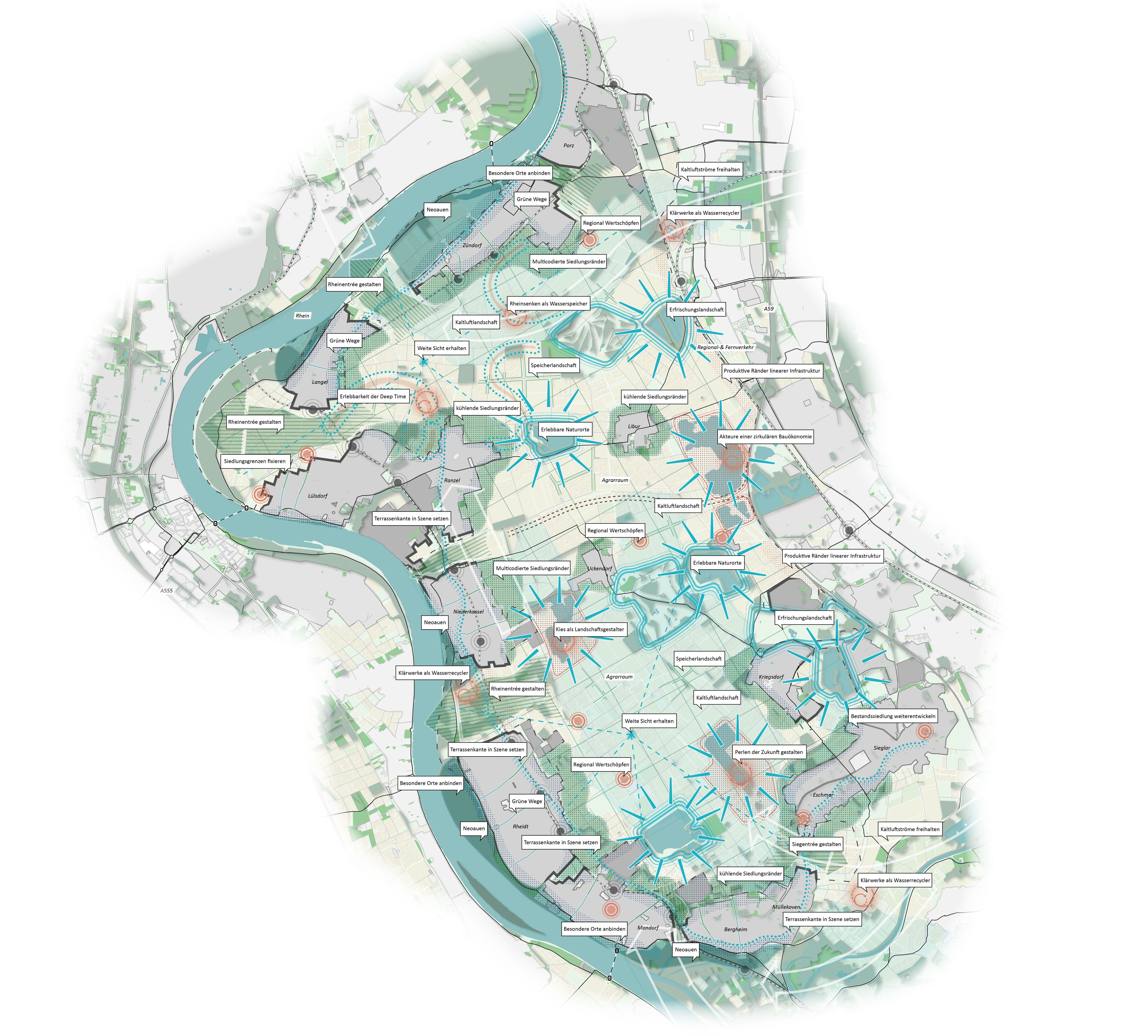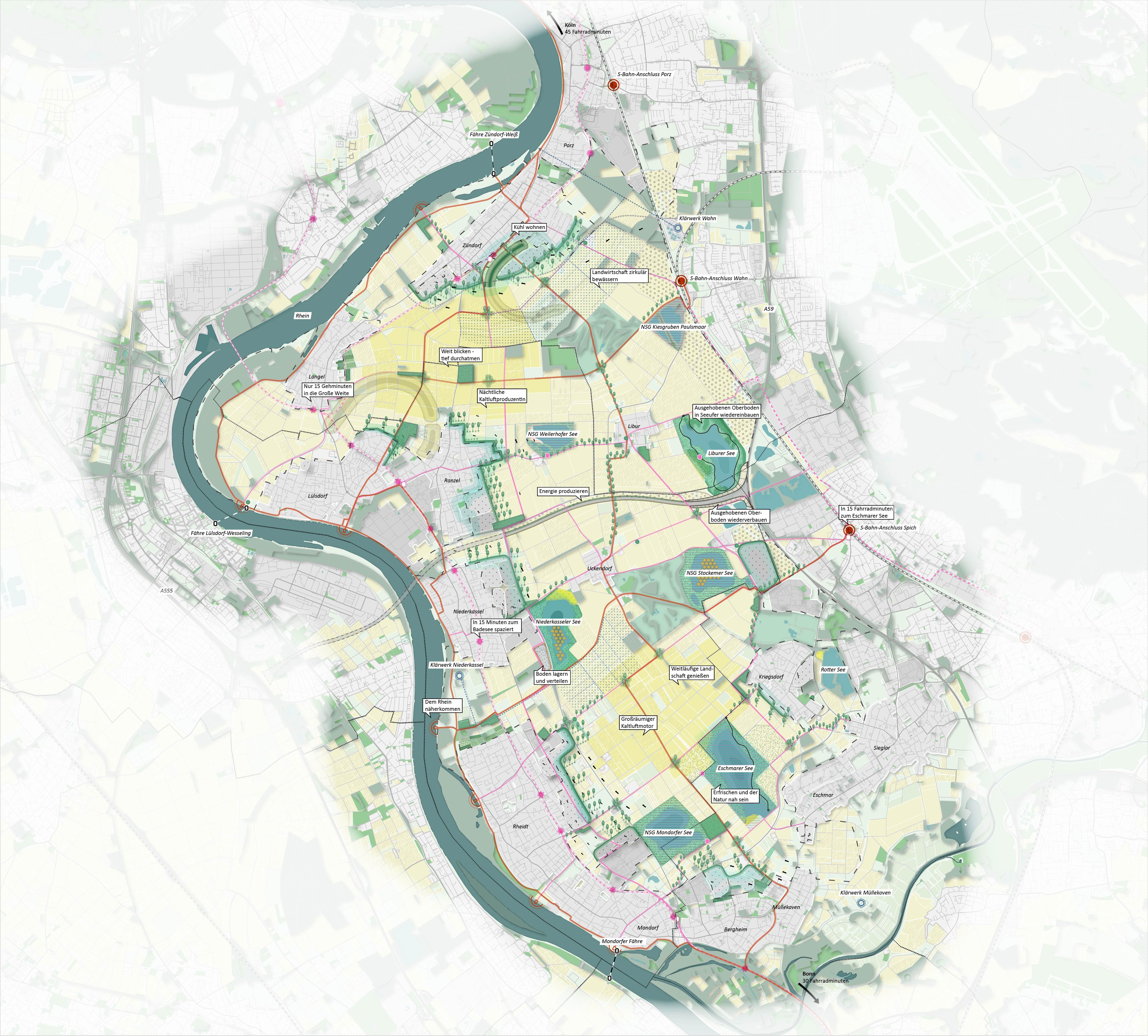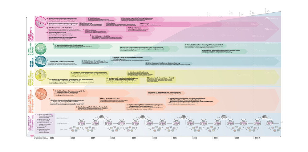 Ein Außenbereich im Innenbereich, so lässt sich die geographische Besonderheit des Planungsraumes MetroKlimaLAB beschreiben. Ein Raum, begrenzt vom Rhein und übergeordneten Verkehrsinfrastrukturen, der sich seine kulturlandschaftliche Prägung noch weitgehend bewahrt hat, doch auch stark unter Veränderungsdruck steht: durch Verkehrsprojekte, Abbau von Rohstoffen, Siedlungsvorhaben und nicht zuletzt durch den Klimawandel. Mit dem Handlungskonzept und den vorgeschlagenen Maßnahmen wird aufgezeigt, wie die regionale Eigenvorsorge in Bezug auf den Klimawandel und die Klimaanpassung aus der Perspektive der Landschaft heraus systematisch und gekoppelt mit den Zielen einer nachhaltigen Entwicklung gestärkt werden kann. Passgenau aufbauend auf den für den Raum zu erwartenden Herausforderungen und den spezifischen Raumtalenten (Räumliche Talente, Klimatalente, Stoffliche Talente, Talentierte Akteure) werden Maßnahmenfelder definiert und Maßnahmenvorschläge konkretisiert. Daraus entsteht ein Handlungskonzept aus sechs Maßnahmenfeldern (Cooles Landschafserleben, Klima-StadtLand Ränder, Klimasensible Landwirtschaft, Wasser + Boden + Energie im Kreislauf bewirtschaften, Aufbau Organisationsstruktur MetroKlimaLAB) mit Aktionsprogramm. Das Konzept der Mehrfachbeauftragung wurde als Grundlage der Zusammenführung der Verfahrensergebnisse ausgewählt.
