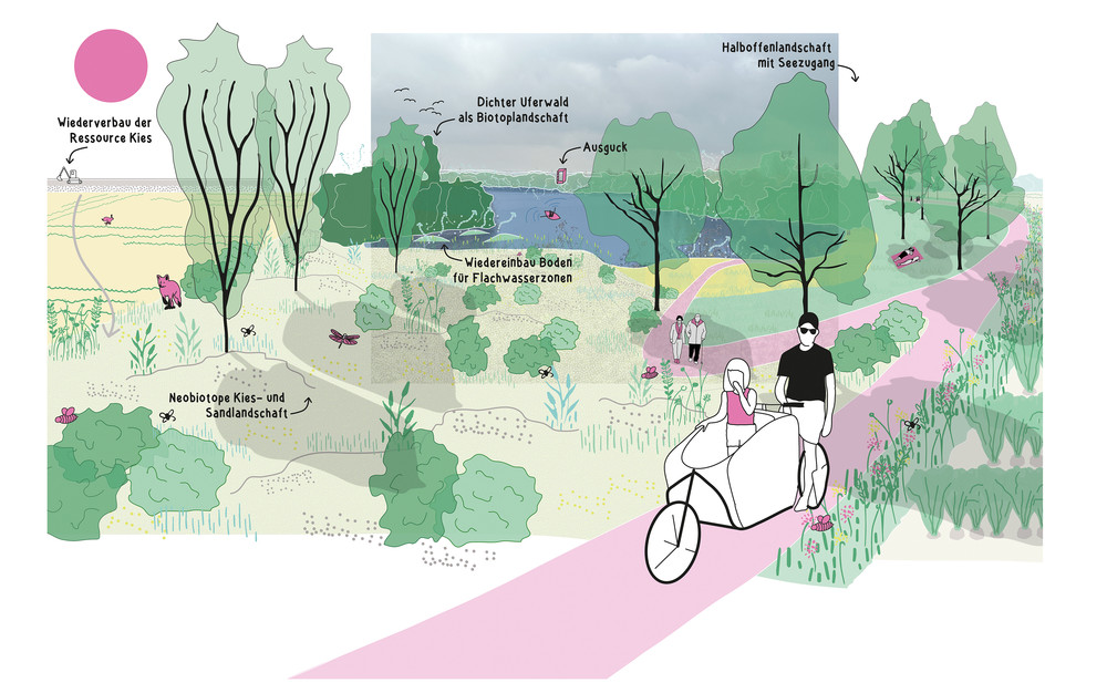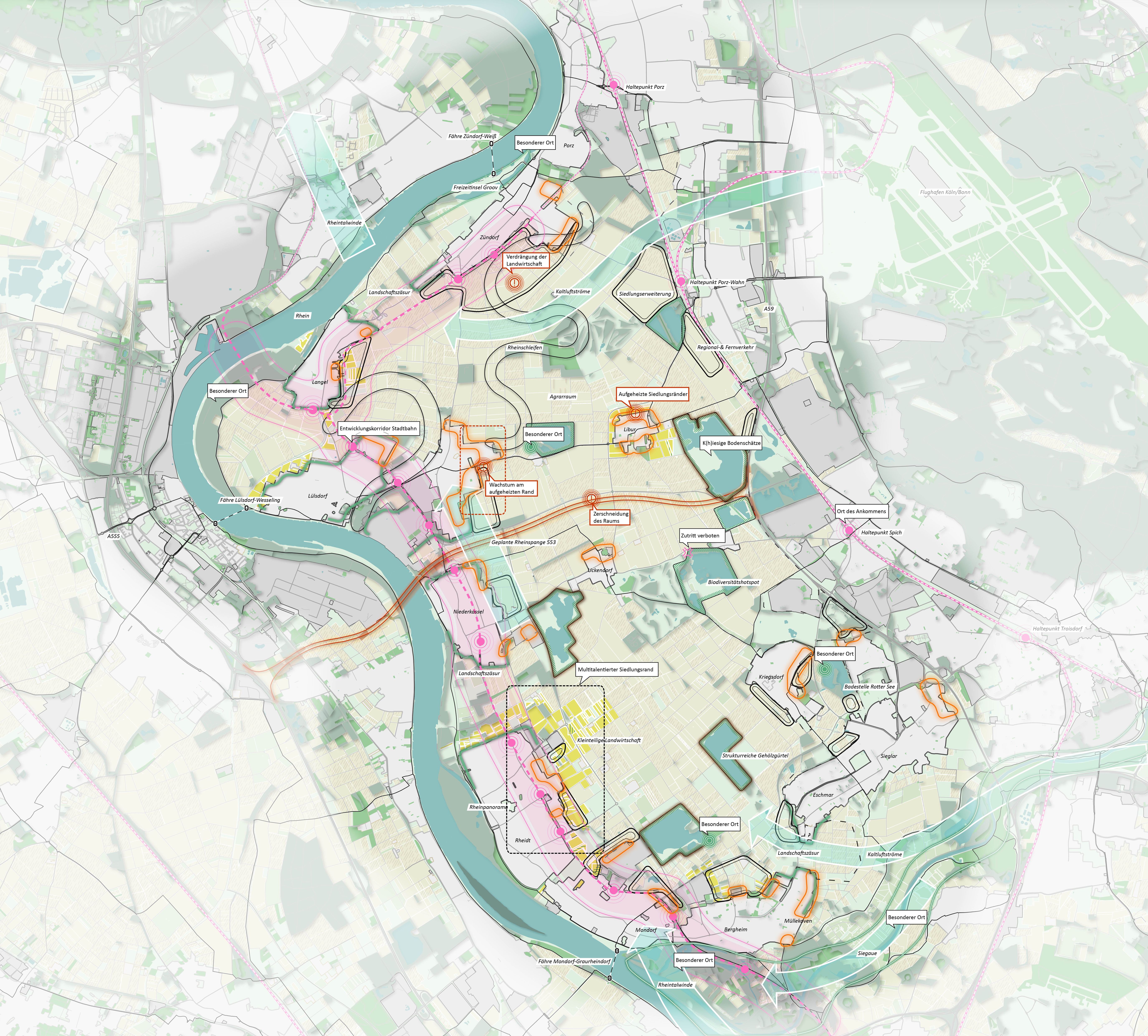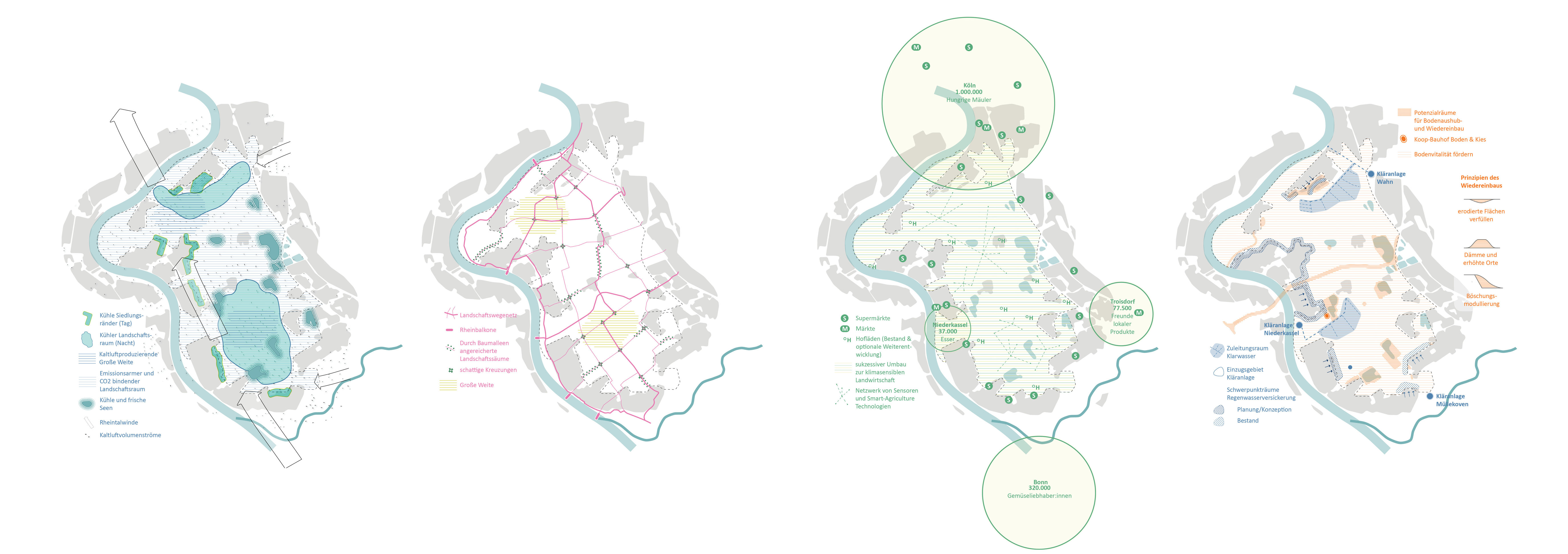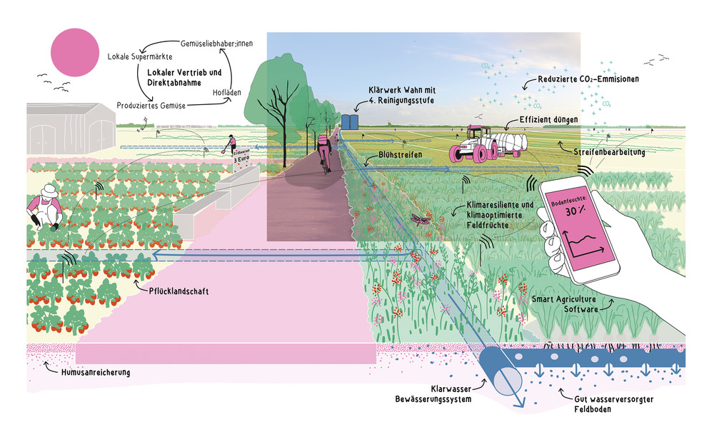 Ein Außenbereich im Innenbereich, so lässt sich die geographische Besonderheit des Planungsraumes MetroKlimaLAB beschreiben. Ein Raum, begrenzt vom Rhein und übergeordneten Verkehrsinfrastrukturen, der sich seine kulturlandschaftliche Prägung noch weitgehend bewahrt hat, doch auch stark unter Veränderungsdruck steht: durch Verkehrsprojekte, Abbau von Rohstoffen, Siedlungsvorhaben und nicht zuletzt durch den Klimawandel. Mit dem Handlungskonzept und den vorgeschlagenen Maßnahmen wird aufgezeigt, wie die regionale Eigenvorsorge in Bezug auf den Klimawandel und die Klimaanpassung aus der Perspektive der Landschaft heraus systematisch und gekoppelt mit den Zielen einer nachhaltigen Entwicklung gestärkt werden kann. Passgenau aufbauend auf den für den Raum zu erwartenden Herausforderungen und den spezifischen Raumtalenten (Räumliche Talente, Klimatalente, Stoffliche Talente, Talentierte Akteure) werden Maßnahmenfelder definiert und Maßnahmenvorschläge konkretisiert. Daraus entsteht ein Handlungskonzept aus sechs Maßnahmenfeldern (Cooles Landschafserleben, Klima-StadtLand Ränder, Klimasensible Landwirtschaft, Wasser + Boden + Energie im Kreislauf bewirtschaften, Aufbau Organisationsstruktur MetroKlimaLAB) mit Aktionsprogramm. Das Konzept der Mehrfachbeauftragung wurde als Grundlage der Zusammenführung der Verfahrensergebnisse ausgewählt.