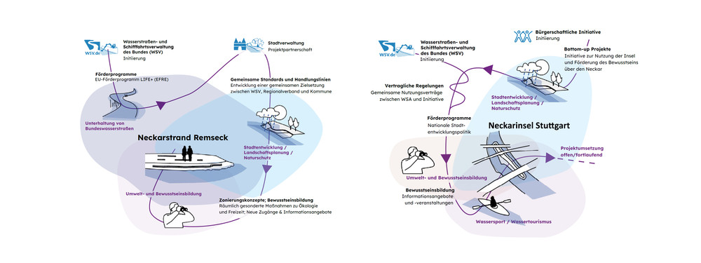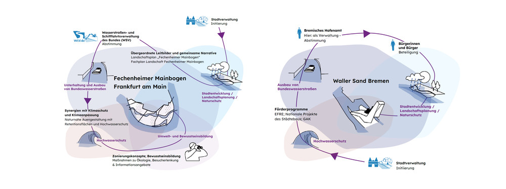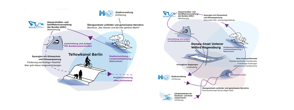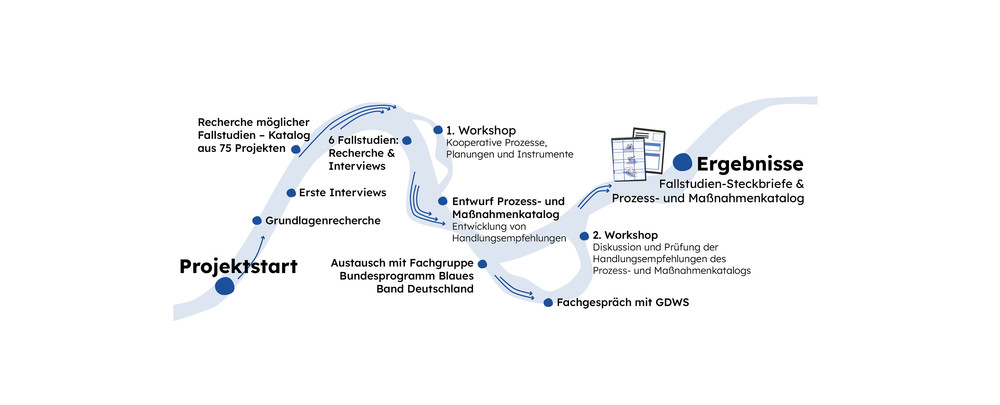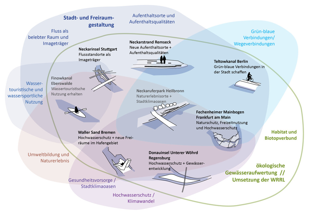 Mit dem im Juni 2021 in Kraft getretenen Gesetz zum wasserwirtschaftlichen Ausbau der Bundeswasserstraßen erhält die Wasserstraßen- und Schifffahrtsverwaltung des Bundes (WSV) die Zuständigkeit, die Binnenwasserstraßen des Bundes wasserwirtschaftlich so auszubauen, dass die Ziele der Wasserrahmenrichtlinie (WRRL) erfüllt werden. Nach WRRL müssen alle Oberflächengewässer in der EU bis 2027 einen „guten ökologischen Zustand“ bzw. bei erheblich veränderten und künstlichen Gewässern ein „gutes ökologisches Potenzial“ erzielen. Vor diesem Hintergrund untersucht das Forschungsprojekt Stadt am Blauen Band die Potenziale von urbanen Gewässerentwicklungskorridoren entlang der Bundeswasserstraßen als Baustein der grün-blauen Infrastruktur für Städte und Siedlungsbereiche. Fallstudien zeigen beispielhaft wie die Binnenwasserstraßen des Bundes mit ihren gewässerbegleitenden Räumen einen bedeutenden Beitrag zur Klimaanpassung leisten und Potenziale als Natur-, Erholungs-, Identitäts- und Kulturräume aktiviert werden können. Für die Erschließung dieser Potenziale liefert das Forschungsprojekt verschiedene Handlungsempfehlungen, Werkzeuge und gute Beispiele für eine kooperative Zusammenarbeit der verschiedenen Akteure und Zuständigkeiten, die in urbanen Gewässerentwicklungskorridoren zusammenkommen.