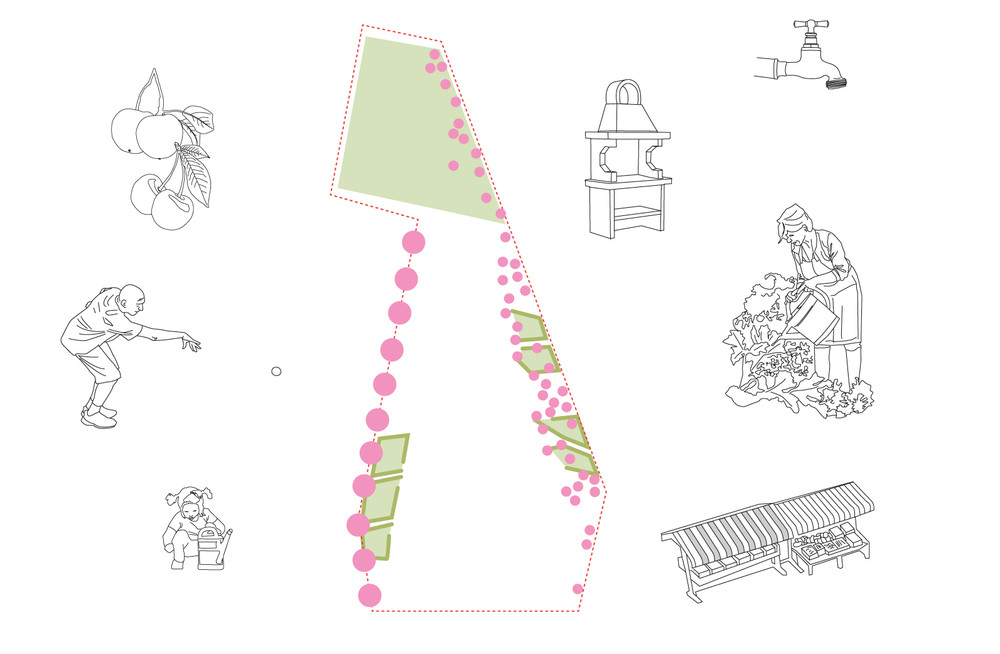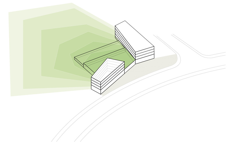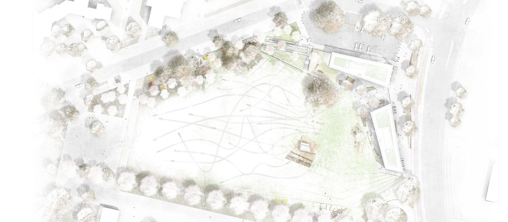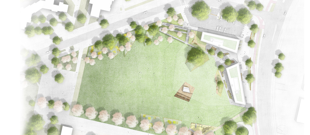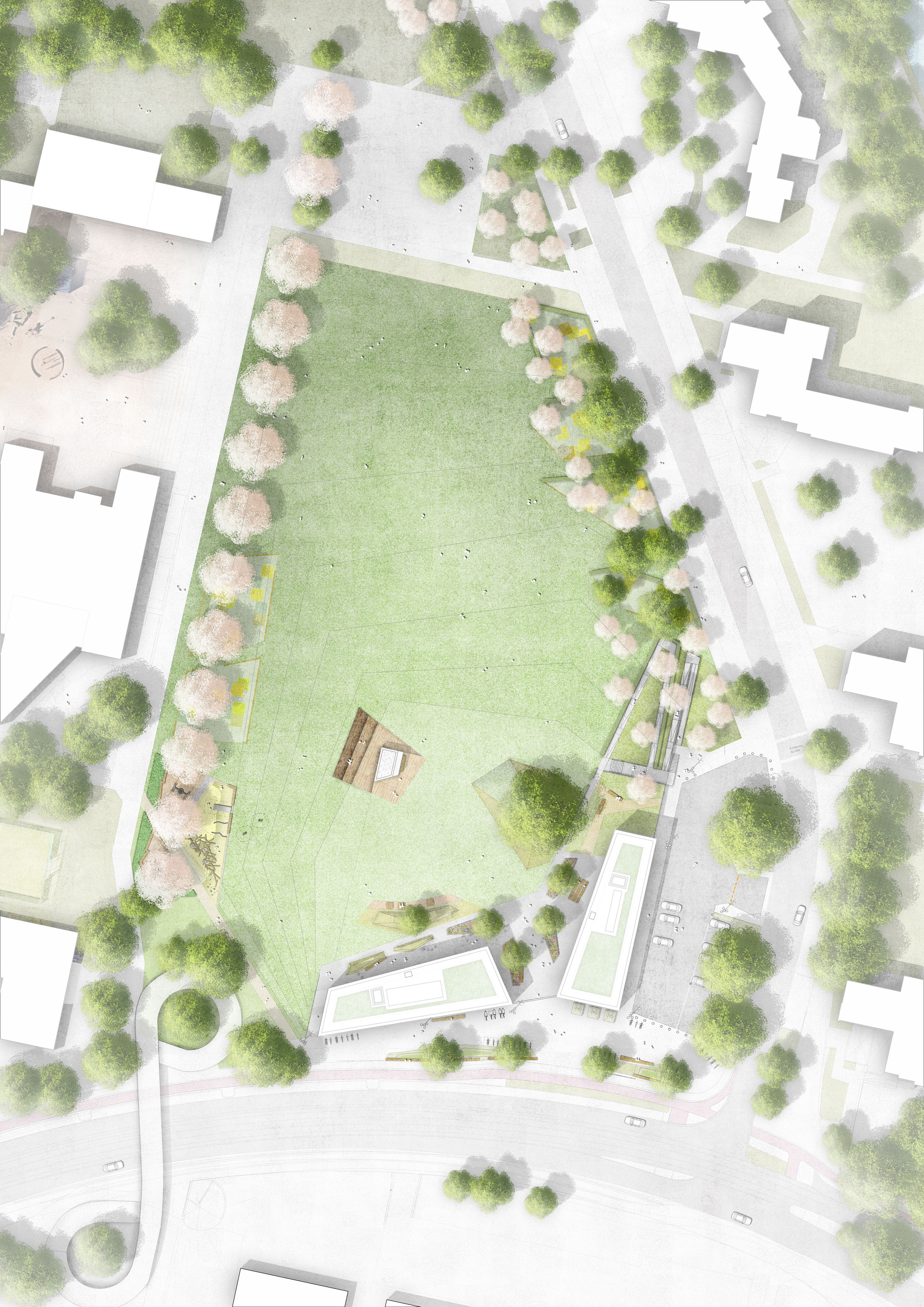 In Bremen Osterholz Tenever entsteht auf einer ehemaligen Rückbaufläche des „Stadtumbau West“ Programms ein neuer, besonderer Ort der Stadtlandschaft. Nachdem zuerst die vollständige Wiederbebauung der Flächen diskutiert wurde, entsteht jetzt ein Park dessen Schnittstelle zur angrenzenden Stadtstraße durch einen Nahversorger und neue Wohnungsbauten neubesetzt wird. Das Ensemble ist Teil der Parktopografie. Während der Nahversorger in einen Hügel integriert wird, markieren zwei aufgehende Wohngebäude die Schnittstelle zum angrenzenden Stadtraum. Im Vorhausbereich adressieren befestigte Platzflächen den Standort zur öffentlichen Stadtstraßenseite. Im rückwärtigen, landschaftsbezogenem Parkraum führt eine zentrale Parkwiese bis auf 5 m über Terrain an die aufgehenden Neubauten heran. Die Anhöhe selbst wird durch einen Hausbaum, ein Podest mit Sitzstufen, zwei hausgemeinschaftliche Hofplätze mit Gemeinschaftsgartenbereich und einen öffentlich zugänglichen Terrassenbereich 'mit Aussicht' besetzt. An den zukünftigen Parkrändern entstehen neue Spielorte, sowie Mitmachräume die nachgefragte Nutzungswünsche aus den angrenzenden Wohnlagen und Gemeinschaftseinrichtungen aufnehmen.