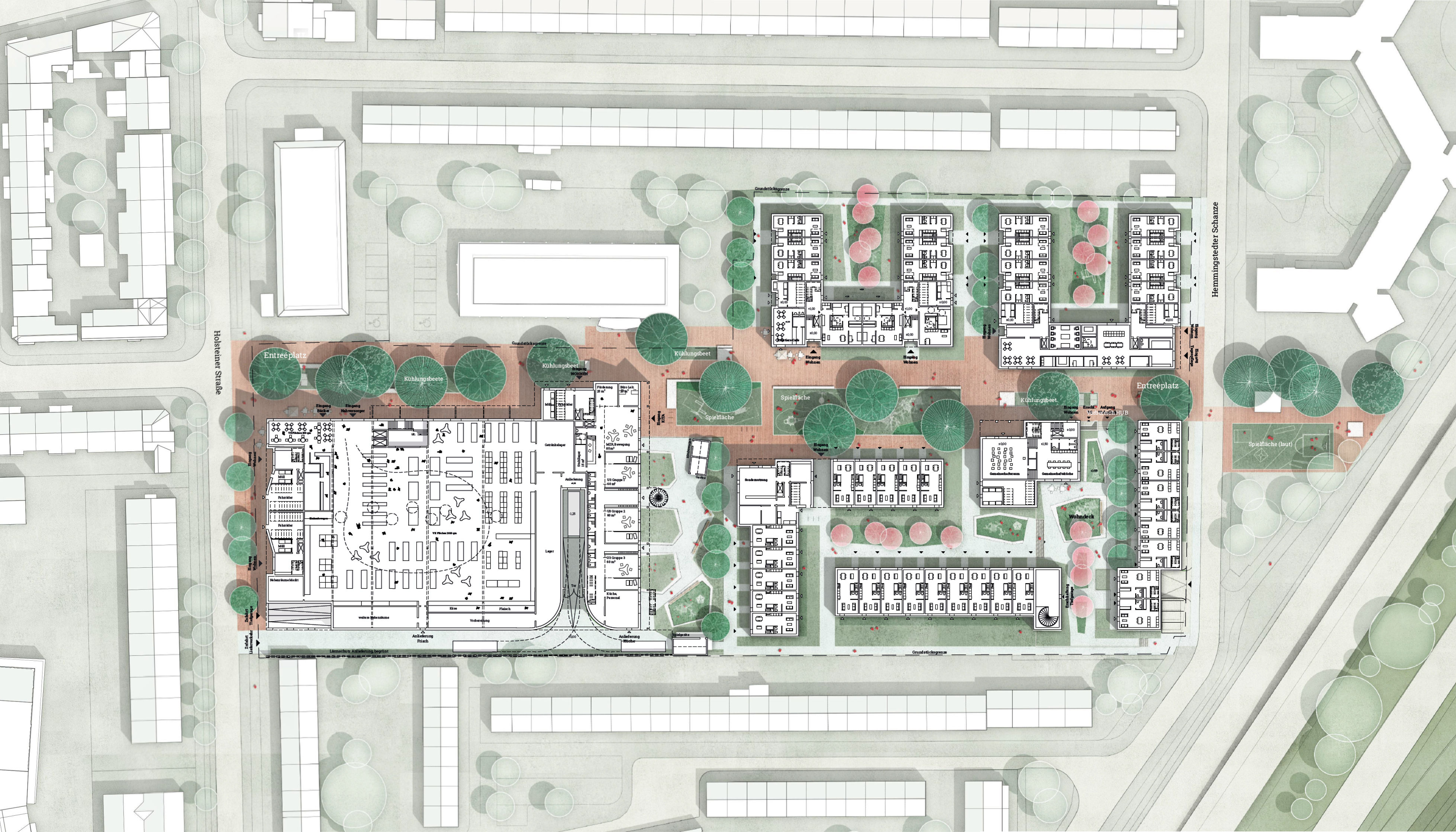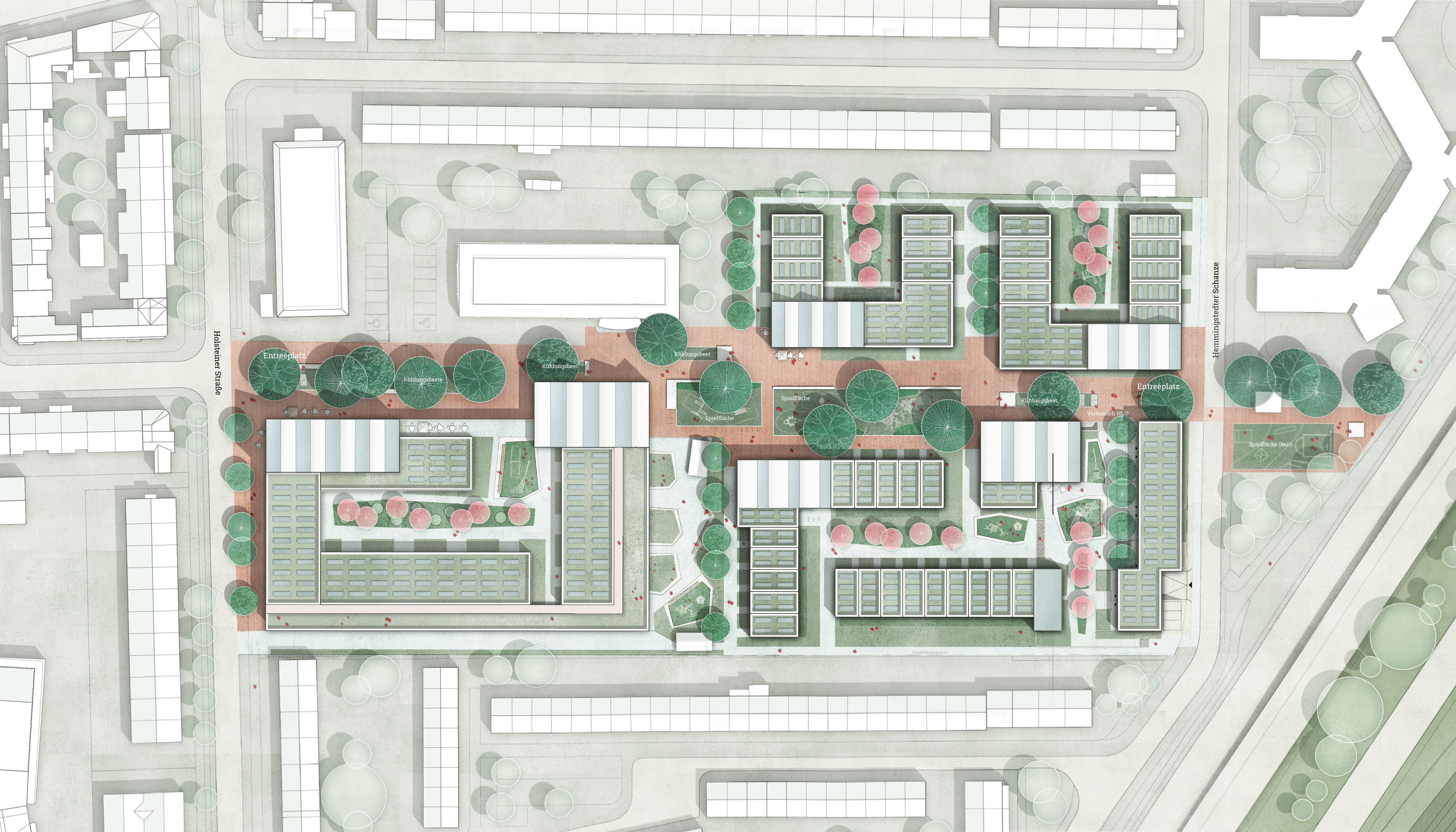 Gegenstand des Wettbewerbs war die Transformation eines Nahversorgerstandorts mit raumgreifenden Parkplatzflächen zum gemischten Stadtquartier. Unser Wettbewerbsbeitrag zielt auf die Entwicklung eines neuen Stadtquartiers mit viel Gemeinschaft. Effizient, nachbarschaftlich organisierte Hausgemeinschaften werden über eine öffentliche 'bunte Quartiersachse' adressiert. Das neue Quartier bringt nicht nur neuen Wohnraum in den Stadtteil, sondern nutzt als Klima-, Nachbarschafts- und Erlebnisquartier Innovationsspielräume in der dichter werdenden Stadt. Im Nachbarschaftsquartier wird die Selbstorganisation durch im Alltag gebrauchsfähige Räume gestärkt. Das Freiraumkonzept positioniert das neue Quartier auf unterschiedlichen Maßstabsebenen. Ein Nahversorger mit Bäckerei, eine Kita, ein Cafe, Gemeinschaftsräume und eine Tagespflegeeinrichtung schaffen vielfältige Schnittstellen am zentralen Rückgrat des Quartiers. Den Wohngebäuden werden geschützte, private Gartenräume zugeordnet, die durch Sekundärerschließungen mit den gemeinschaftlich genutzten Gartenhöfen in Verbindung stehen. Alle Nachbarschaften erhalten eigene Spiel- und Begegnungsräume die aus den Wohnungsbereichen heraus gut einsehbar sind. Dachflächen werden genauso als Gartenhöfe bespielt, wie die erdgebundenen, rückwärtig orientierten Lagen. Zentraler Baustein des Klimakonzepts ist ein Regenwassermanagement, dass sich die Abflussfreiheit des neuen Stadtquartiers zum Ziel setzt. Die Quartierspromenade, die Wohnwege und die Gemeinschaftshöfe sind durch ein abgestuftes Baumkonzept mit hohem Wiedererkennungswert gekennzeichnet. Die Anreicherung des Promenadenraums und der Gartenhöfe mit schattenspendenden Klimabäumen erfolgt in Kombination mit Aufenthaltsangeboten und Treffpunkten.