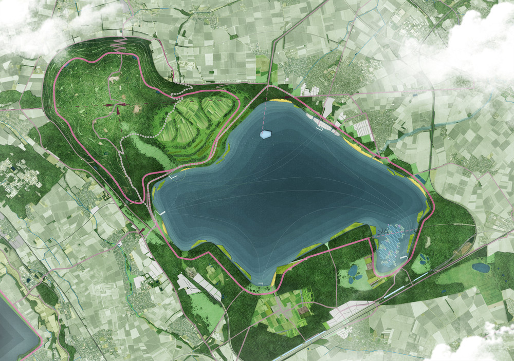 Der Prozess des Strukturwandels im Rheinischen Revier kommt in Bewegung. Mit der Raumentwicklungsperspektive formulieren die Anrainerkommunen des Tagebaus Hambach Zukunftsstrategien für den Transformationsprozess hin zu einer Seelandschaft. Zusammen mit MUST und Planersocietät hat bgmr Nutzungstypologien, Netze und Zukunftsbilder für drei Zeitphasen der Transformationslandschaft entwickelt. Im Fokus der Untersuchung stehen die nachhaltige wirtschaftliche Entwicklung, die Implementierung von Klimaanpassungsstrategien, der Aufbau zukunftsorientierter Mobilitätsnetze, Leitprojekte regenerativer Energieerzeugung, die Stärkung der produktiven Kulturlandschaft und der Aufbau eines biodiversen regionalen Bioshärenverbunds.