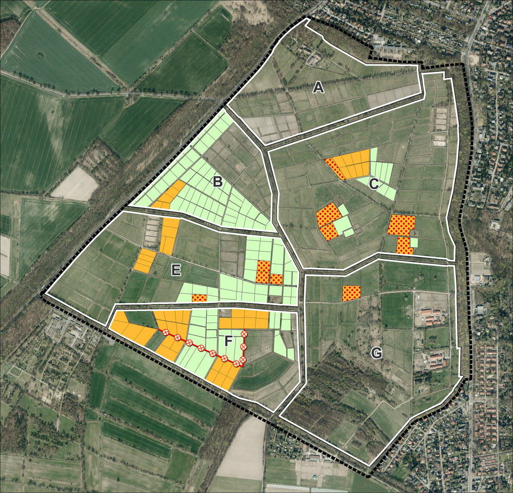 Als Ziele wurden festgelegt, die landwirtschaftliche Nutzung unter Berücksichtigung der vorhandenen Bodenbelastungen zu erhalten (vorrangige Grünlandnutzung), das LSG für extensive Formen der Erholungsnutzung zu sichern und es als Ausgleichsraum für den Arten- und Biotopschutz zu qualifizieren. So wurden Pflege- und Entwicklungsmaßnahmen schwerpunktmäßig so konzipiert, dass sie zur Kompensation von Eingriffen (Natur und Landschaft, Artenschutz) geeignet sind. Für den Artenschutz wurden z.B. produktionsintegrierte Maßnahmen (PIK) auf den Landwirtschaftsflächen zum Schutz von Bodenbrütern wie der Feldlerche abgestimmt. Für das nicht mehr benötige Netz von Gräben und Wällen wurde ein Umnutzungskonzept als Zauneidechsenhabitat entwickelt.
