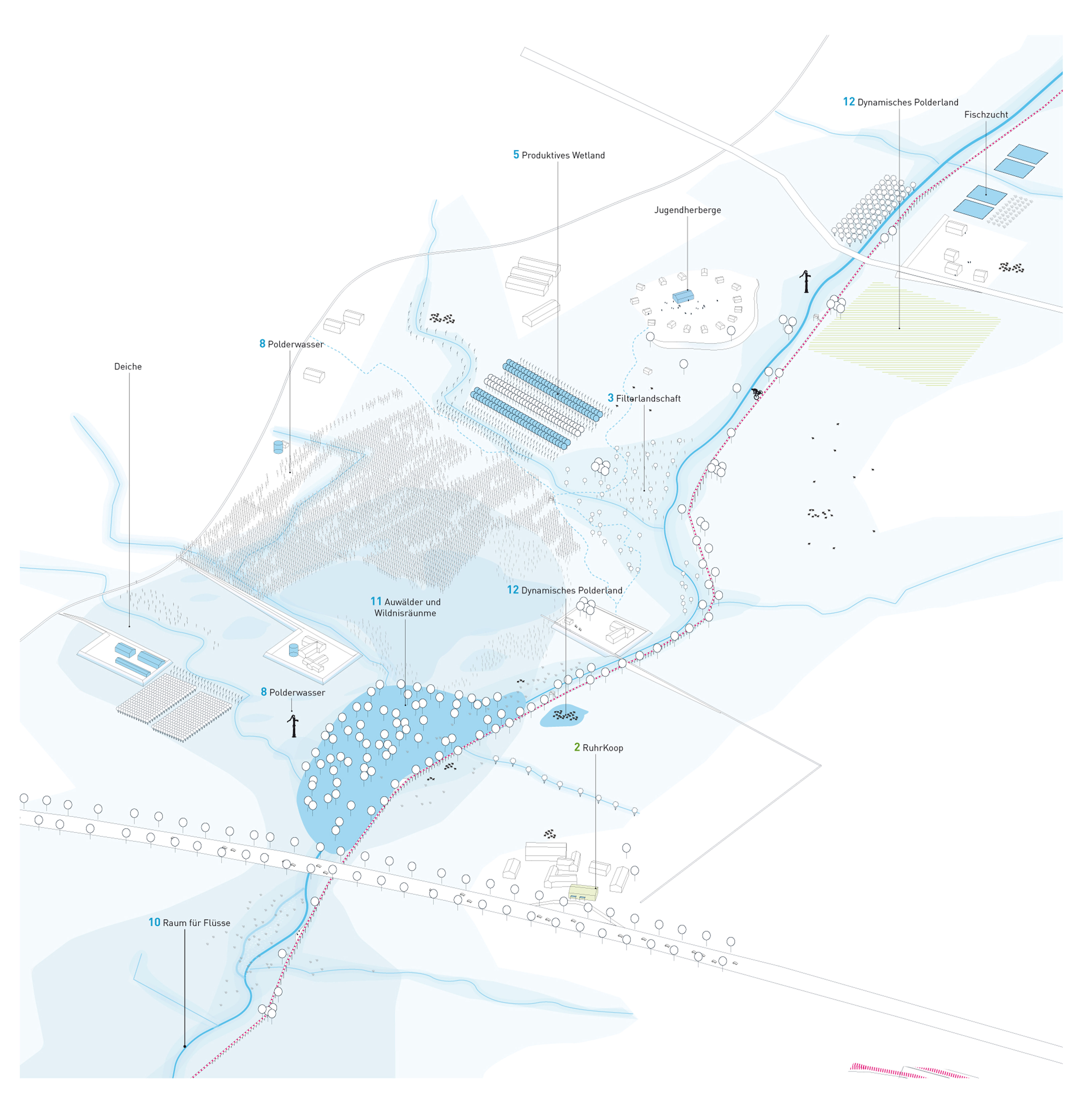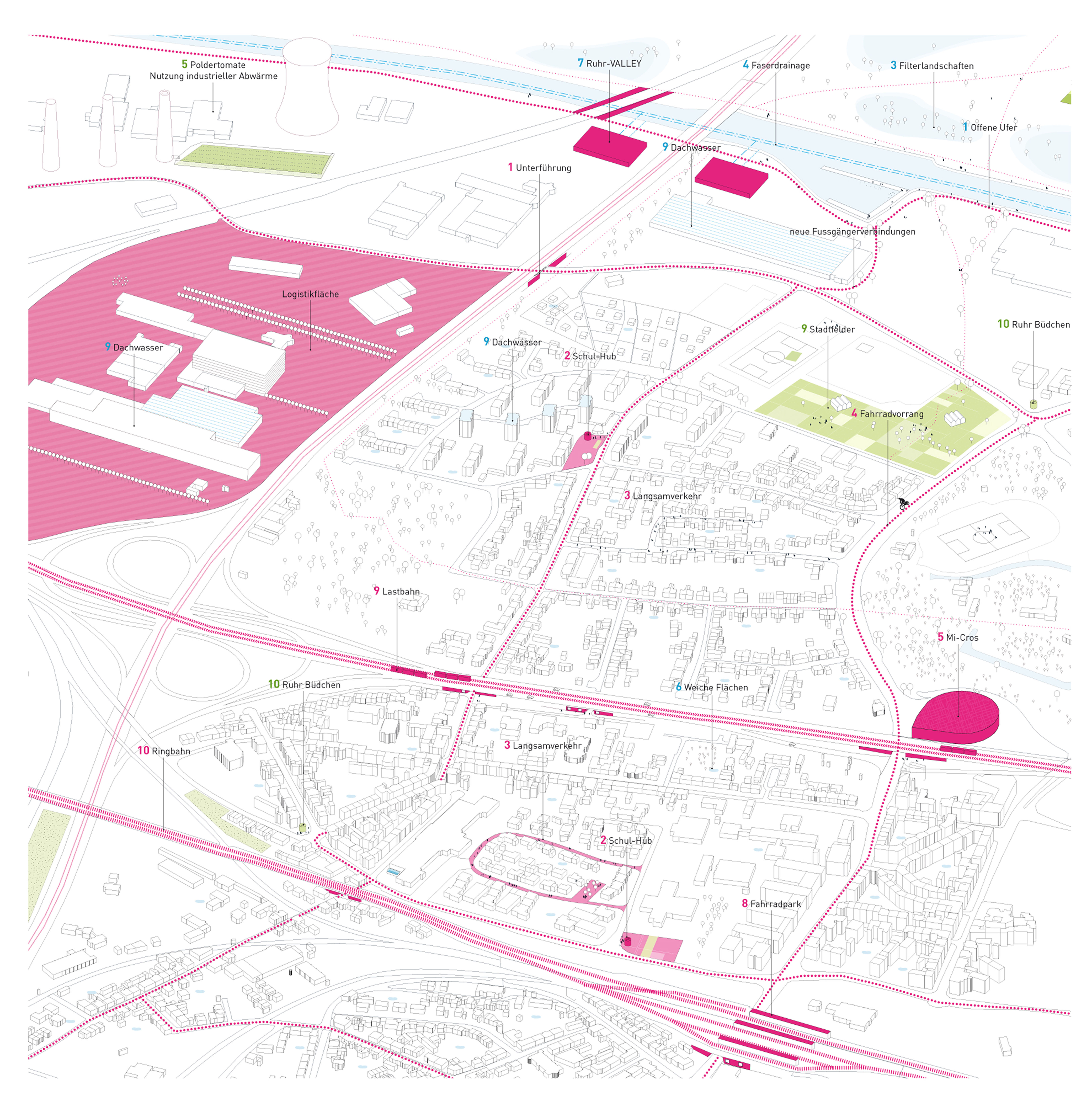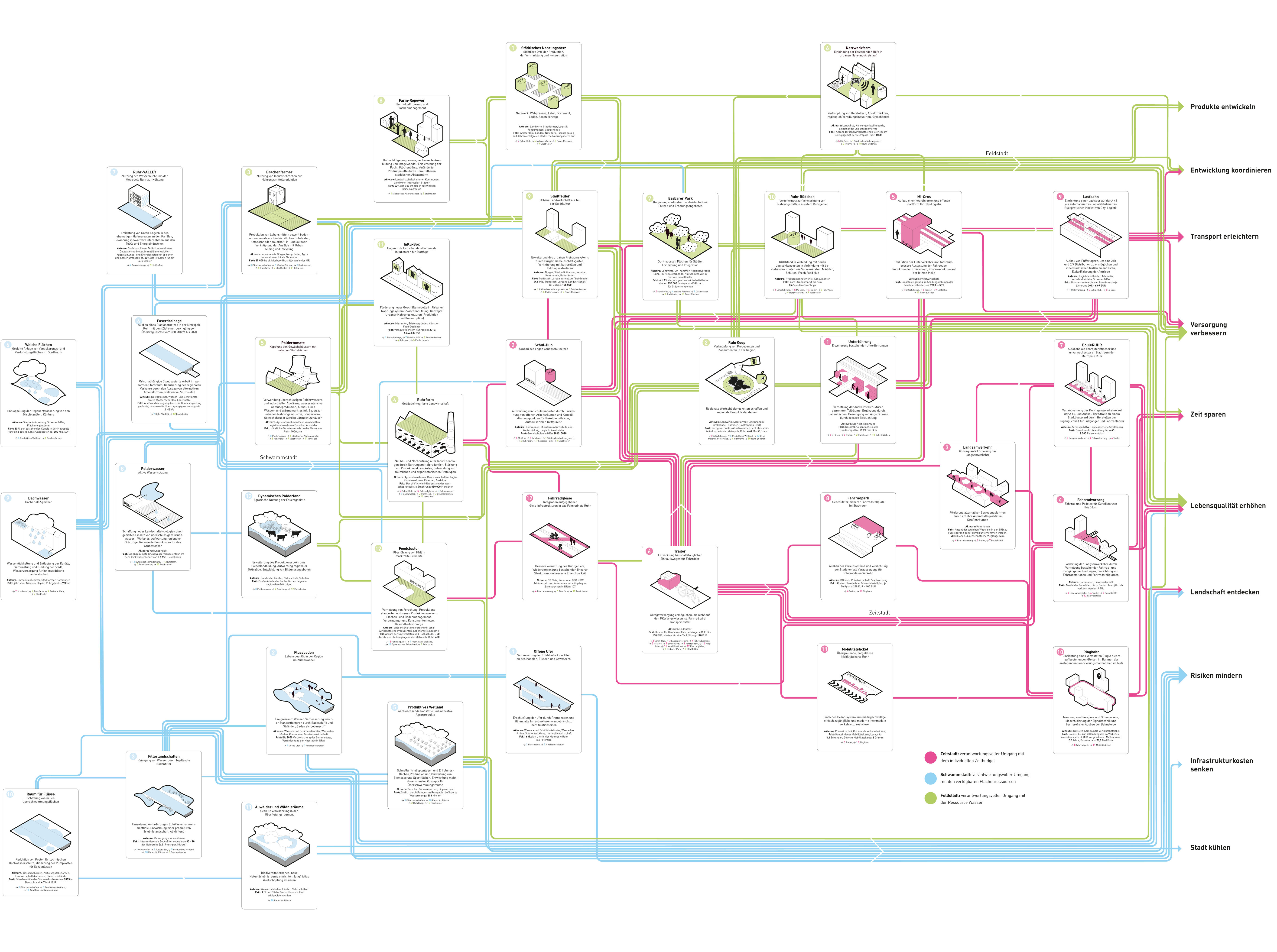 Die Zeitstadt unterstützt das Individuum bei seinem Zeitmanagement im Alltag in einem urbanen Ballungsraum. Die Feldstadt strukturiert den Umgang mit den großen landwirtschaftlichen Bereichen und den urbanen Resträumen der Metropole Ruhr. Die Schwammstadt steht für einen produktiven Umgang mit der Ressource Wasser.