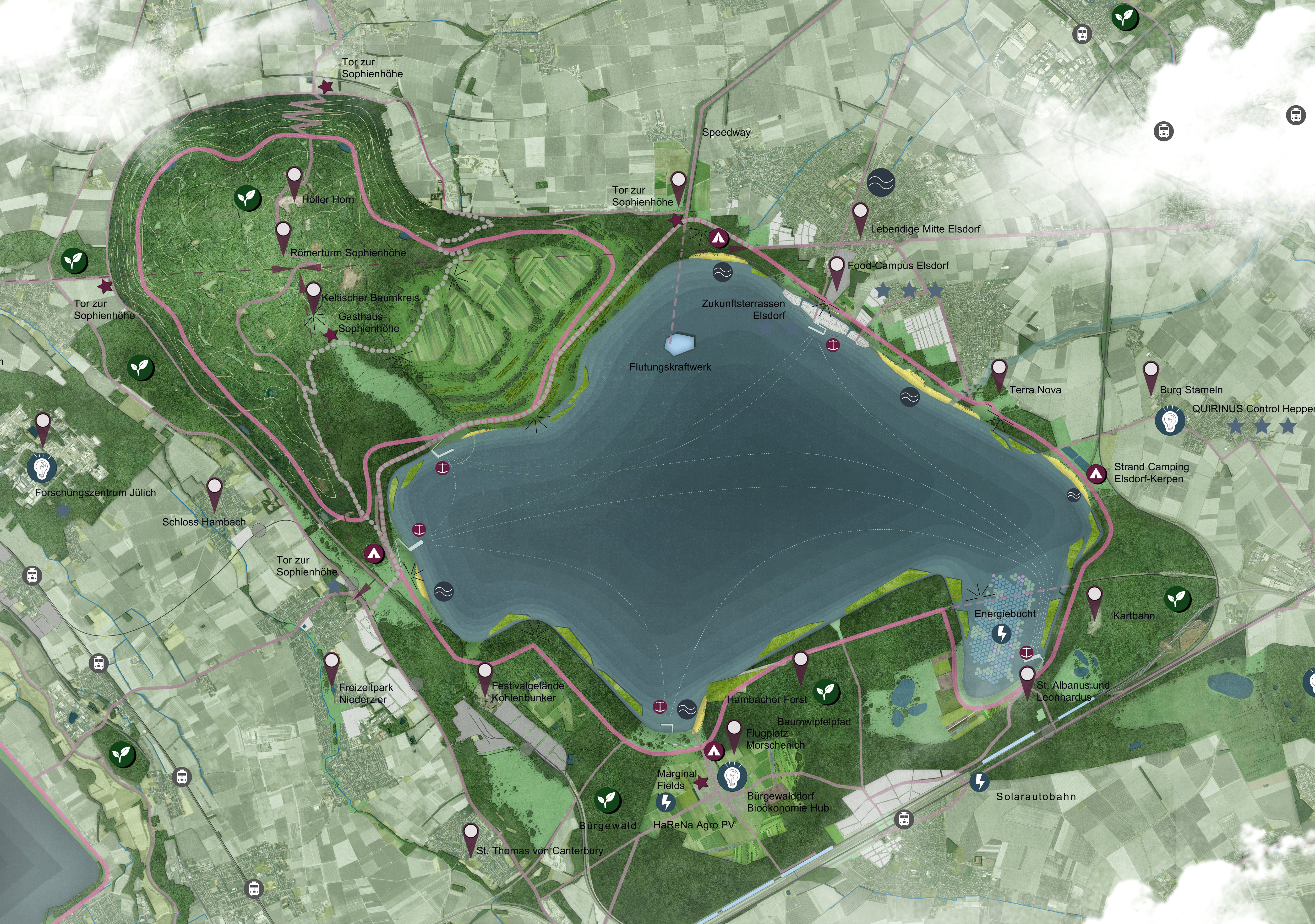 Der Prozess des Strukturwandels im Rheinischen Revier kommt in Bewegung. Mit der Raumentwicklungsperspektive formulieren die Anrainerkommunen des Tagebaus Hambach Zukunftsstrategien für den Transformationsprozess hin zu einer Seelandschaft. Zusammen mit MUST und Planersocietät hat bgmr Nutzungstypologien, Netze und Zukunftsbilder für drei Zeitphasen der Transformationslandschaft entwickelt. Im Fokus der Untersuchung stehen die nachhaltige wirtschaftliche Entwicklung, die Implementierung von Klimaanpassungsstrategien, der Aufbau zukunftsorientierter Mobilitätsnetze, Leitprojekte regenerativer Energieerzeugung, die Stärkung der produktiven Kulturlandschaft und der Aufbau eines biodiversen regionalen Bioshärenverbunds.